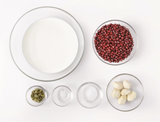 팥 1½컵, 밤 6개, 우유 2컵, 소금 약간, 설탕 1t, 호박씨 1T