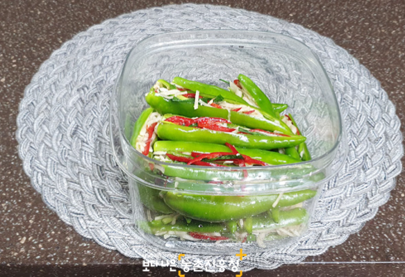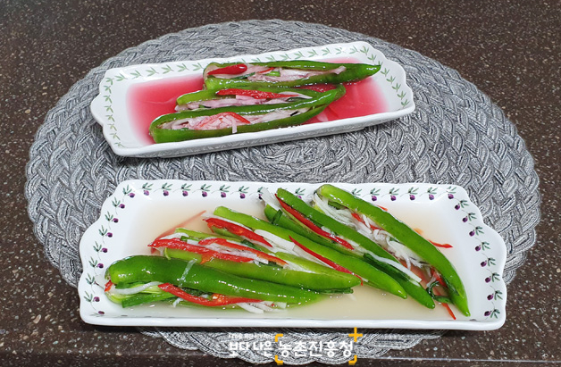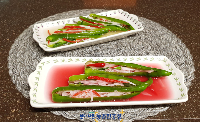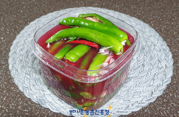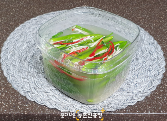 여름 밑반찬으로 고기 구워 먹을 때 상큼하게 입맛을 돋워 줄 풋고추 물김치도 완성되었습니다.