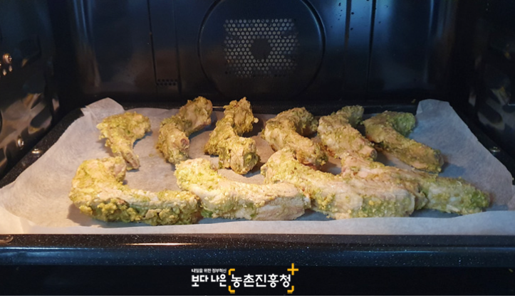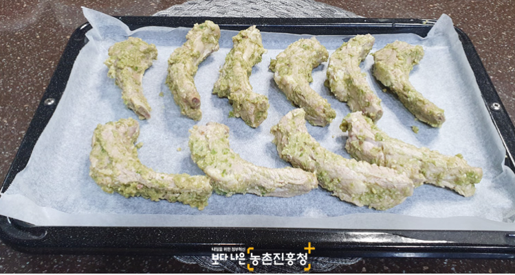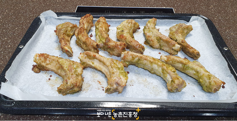 4. 200℃로 예열한 오븐에 페스토에 버무린 등갈비를 올리고 10~12분간 구워줍니다.