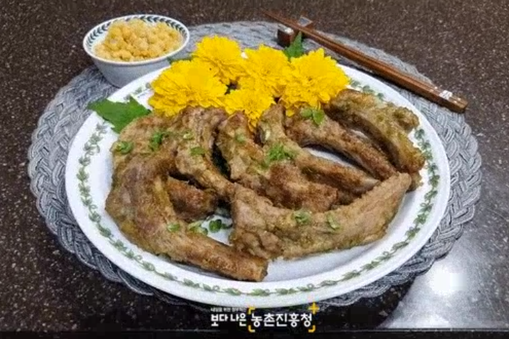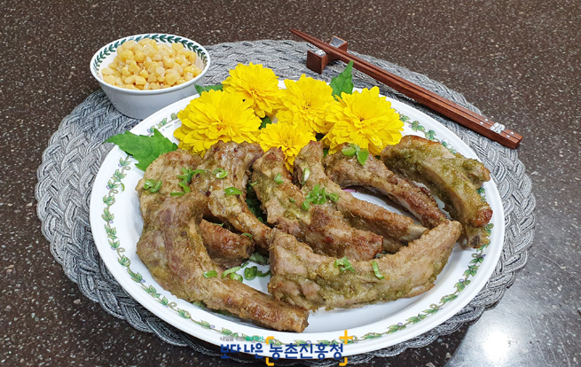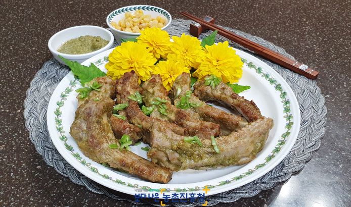 보기 좋은 떡이 맛이 좋다고, 삼잎국화꽃을 풋고추 돼지 등갈비 구이 접시에 올렸더니 더 보기 좋습니다.