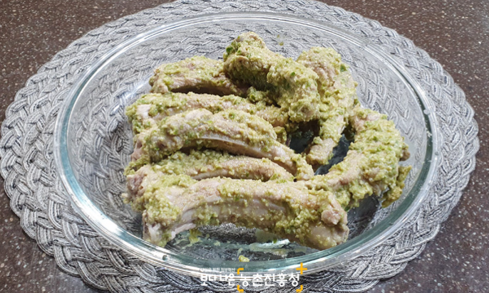 3. 데친 등갈비와 풋고추 페스토를 잘 버무린 뒤 랩을 씌워 냉장실에서 30분 정도 숙성시킵니다.