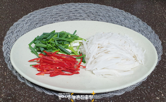 4. 무는 3cm 길이로 채 썰어 준비하고, 쪽파, 홍고추도 같은 길이로 채 썰어 준비합니다.