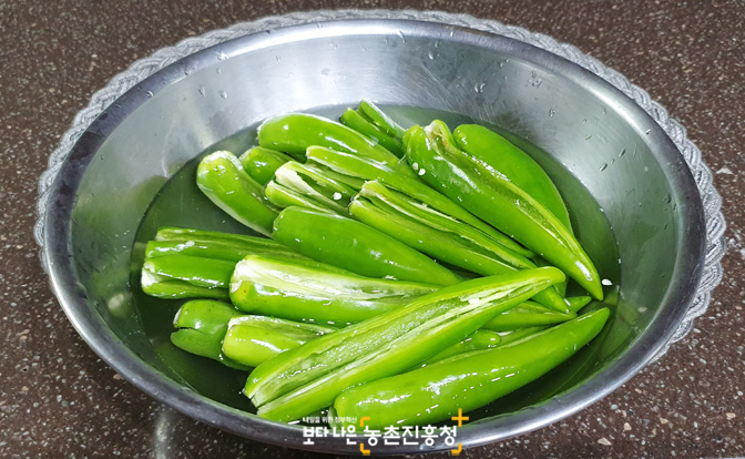 3. 물 5컵에 굵은소금 1/2컵을 풀고 그 물에 씨를 뺀 풋고추를 담아 절입니다.