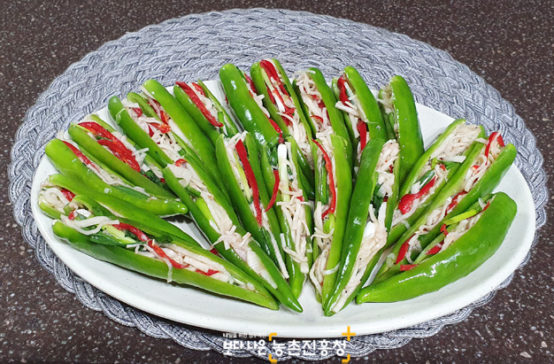 6. 절여진 풋고추의 물기를 빼고 칼집을 넣은 사이에 준비한 김칫소를 넣어 채워줍니다.