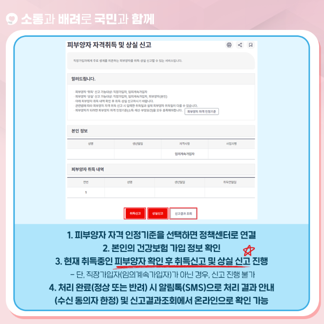 - 피부양자 자격 취득 및 상실 신고는 직장가입자(또는 임의계속가입자)가 할 수 있으며, 상실 신고의 경우에는 피부양자 본인이 직접 신고 가능