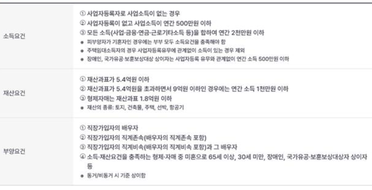 · 자격 인정 기준 : 피부양자가 되려는 자는 소득·재산·부양 요건을 모두 충족하여야 함