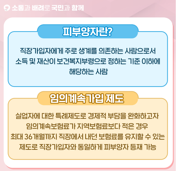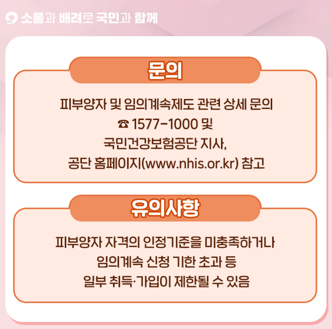 피부양자 및 임의계속제도 관련 상세 문의 1577-1000 및 국민건강보험공단 지사, 공단 홈페이지(wlww.nhis.or.kr) 참고