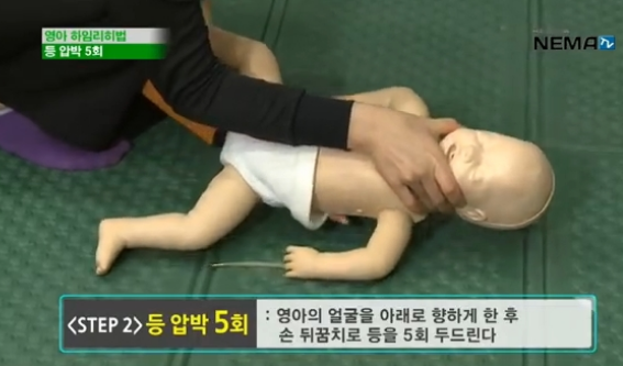 성인이 아닌 영아의 경우라면 성인과 달리 뒤에서 안는 방식으로 하임리히법을 실시하지 말고, 환자의 배를 팔 위에 올려놓고 머리가 아래 방향으로 가도록 거꾸로 받칩니다. 이때 환자의 머리와 가슴 부위가 팔에 고정되도록 잡아야 합니다. 머리를 가슴보다 낮게 한 다음 영아를 안은 팔을 허벅지에 고정시킨 뒤 손바닥으로 영아의 견갑골을 5회가량 두드립니다.