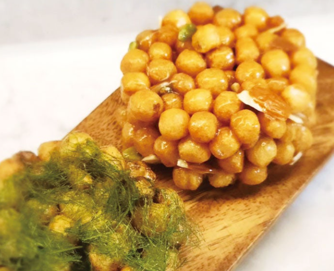 오란다도 강정의 한 종류입니다. 동글동글 앙증맞은 비주얼. 바삭바삭한 식감을 자랑하는 오란다는 만들어볼 만합니다. 팬에 조청과 버터를 넣고 약불에 끓이다가 거품이 보글보글 끓기 시작하면 퍼핑콩(알알이)과 검은깨를 넣습니다. 주걱으로 재료를 고루 섞다가 퍼핑콩 사이마다 거미줄 같은 얇은 실타래가 생기면 불을 끕니다. 준비된 틀에 오란다를 조심히 붓고, 주걱을 이용해 전체적으로 평평하게 폅니다. 오란다가 미지근하게 식으면 도마 위에 올려놓은 뒤 원하는 크기나 모양으로 자르면 됩니다.