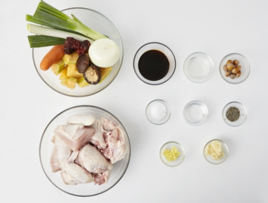 닭볶음탕용 닭 1마리(1kg), 늙은 호박 200g, 양파 1개, 대파 1개, 대추 4알, 당근 1/2개, 불린 표고버섯 2개, 은행 10알, 식용유 1큰술, 양념장( 간장 1컵, 다진 마늘 2큰술, 맛술 3큰술, 후춧가루 약간, 설탕 1큰술, 올리고당 2큰술, 다진 생강 1/2작은술)