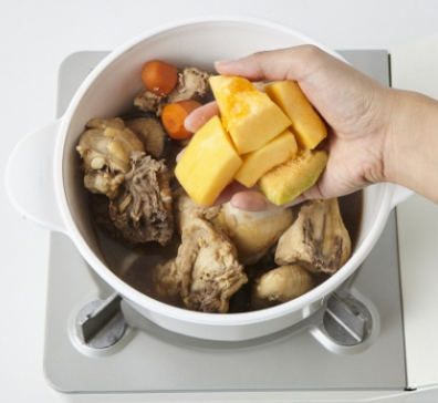 5. 늙은 호박, 양파, 대추, 불린 표고를 넣어 20분간 더 삶아줍니다.