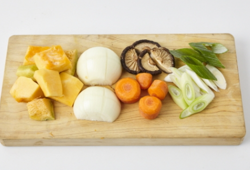 2. 늙은 호박, 양파, 당근, 불린 표고버섯은 깍둑 썰고, 대파는 어슷썰어줍니다.