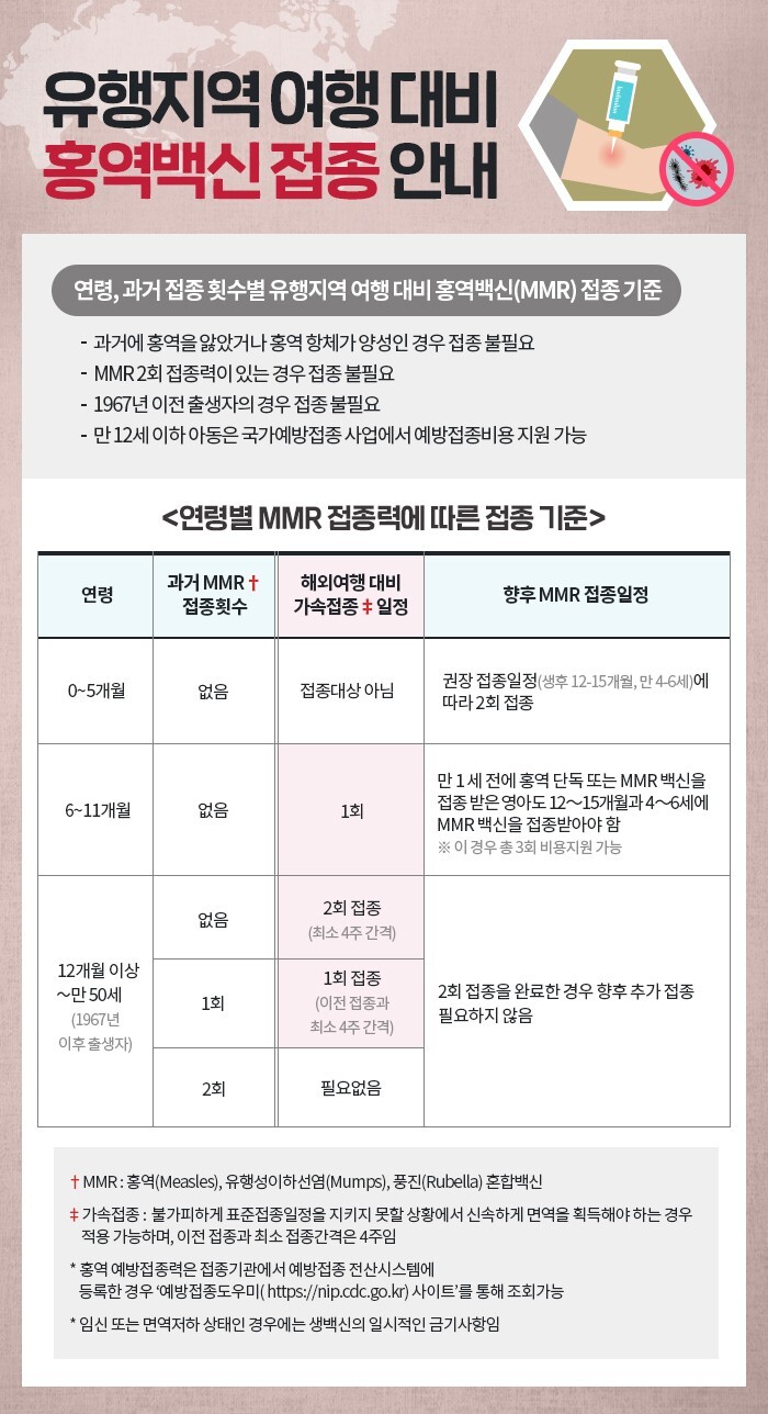 국내 대규모 유행 가능성은 매우 낮지만 홍역의 해외 유입 방지 및 전국 확산 방지를 위해 특히 접종시기가 안 된 영아(12개월 미만), 면역력이 저하된 개인(고위험군), 홍역 유행 국가 여행 계획이 있는 사람은 예방접종 이력을 확인하는 등 주의가 필요합니다.