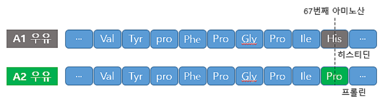 A2 우유는 우유 단백질의 80%를 차지하는 카제인(caseins) 단백질 중 β-카제인의 67번째 아미노산 서열로 정해집니다. 베타(β)-카제인의 67번째 아미노산의 서열이 히스티딘(histidine)이면 A1우유가 되고 프롤린(proline)이면 A2 우유가 됩니다.