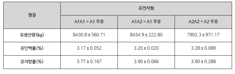 A1/A2 유전자의 또 하나의 속설은 A1/A2 유전자형에 따라 유생산량에 차이가 있냐는 것입니다. 이에 대해 여러 연구들이 진행되었는데, A1A1, A1A2, A2A2 젖소의 유생산량을 비교한 결과, A1 유전자를 보유한 젖소가 유량이 더 높은 경향이 있다는 여러 보고가 있었습니다.