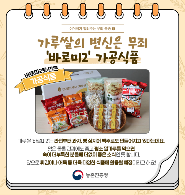 수많은 쌀 품종 가운데, 밀가루를 대체할 수 있는 특별한 힘을 가진 쌀이 있습니다. 이름하여, '가루쌀' 들어보셨나요? 요즘 과자는 물론 라면, 빵, 약과, 맥주 등으로 무한변신하며 주목받고 있는 '가루쌀' 품종, '바로미2'의 인기비결을 소개해 드리겠습니다.
