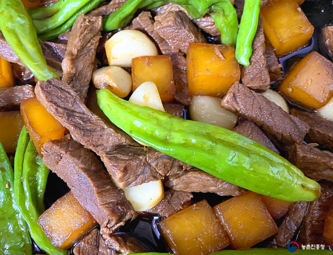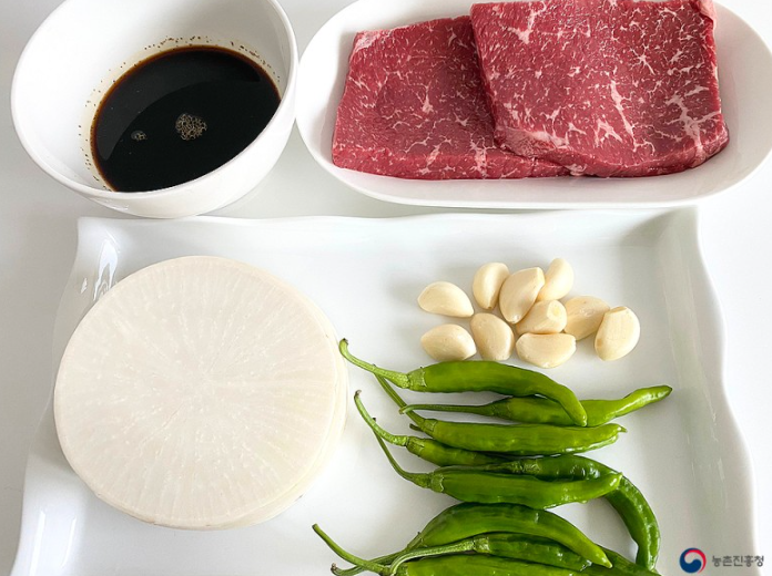 소고기(한우 우둔살 300g), 무 1/3(중간부분), 꽈리고추 10개, 깐 마늘 10개, 물 4컵, 통깨 약간, 양념장(진간장 1/2컵, 맛술 4큰술, 설탕 2큰술, 후춧가루 약간)