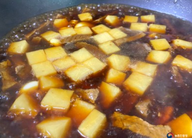 4. 프라이팬에 물 4컵을 붓고 소고기와 양념장 재료(진간장 1/2컵, 맛술 4큰술, 설탕 2큰술, 후춧가루 약간)를 넣고 10분간 중불에 끓여줍니다.