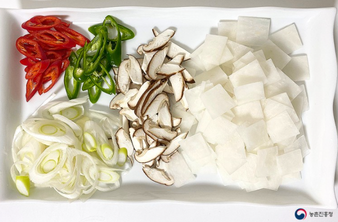 무 400g, 소고기(한우 양지 100g), 대파 1/2(흰부분), 청고추 1개, 홍고추 1개, 자른 다시마 10장, 표고버섯 3개, 다진 마늘 1/2큰술, 국간장 1/3큰술, 소금 1큰술, 물 1L