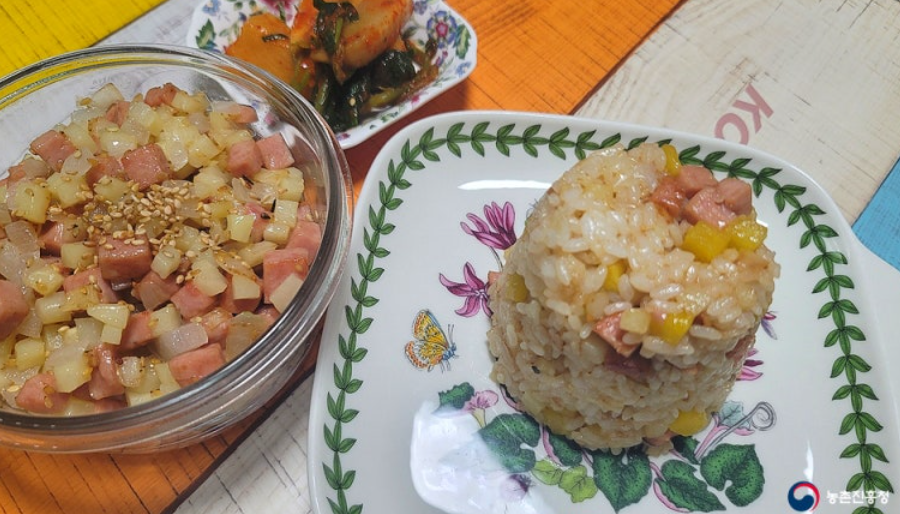 중간크기 감자 2알, 통조림 햄 120g 2개, 양파 1개, 식용유 1큰술, 깨소금 1/2큰술