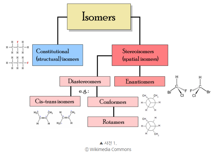 거울상 이성질체에서 이성질체(isomer)란 분자식은 같지만 구조가 다른 화합물입니다. 이성질체는 크게 구조 이성질체(constitutional isomer)와 입체 이성질체(stereoisomer) 두 종류로 나뉩니다. 구조 이성질체는 분자식은 동일하지만 원자들의 연결된 순서가 다른 물질을 말합니다. 예를들어, 에탄올과 다이메틸에터는 C2H6O로 같은 분자식을 갖지만 에탄올은 CH3CH2OH, 다이메틸에터는 CN3OCH3로 결합의 연결 순서가 다른 구조 이성질체입니다. 반면 입체 이성질체는 원자들의 결합 연결 순서는 동일하지만 공간상의 배향이 다른 물질입니다. 이러한 입체이성질체의 종류로 부분입체 이성질체(diastereomer)와 오늘 알아볼 거울상 이성질체(enantiomer)가 있습니다.