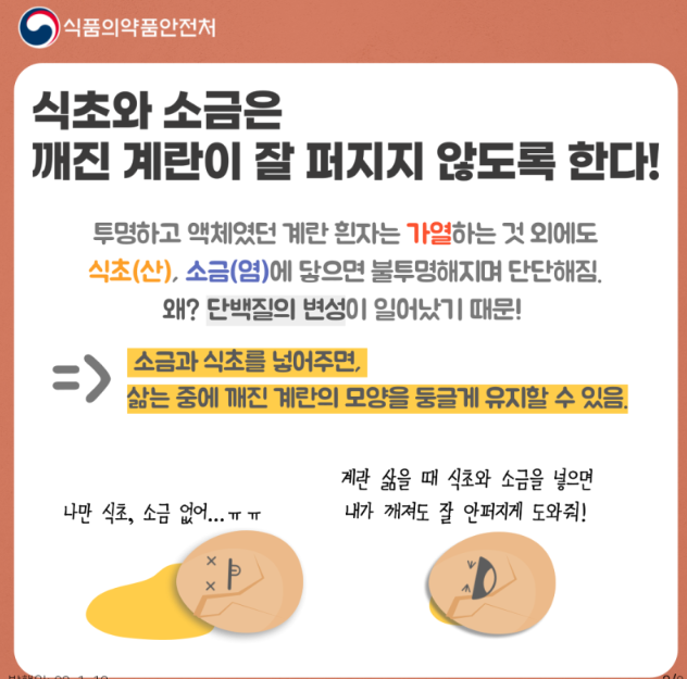 식초와 소금은 깨진 계란이 잘 퍼지지 않도록 한다!