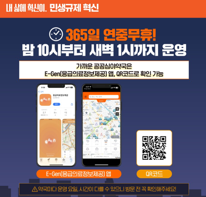 가까운 공공심야약국은 E-Gen(응급의료정보제공) 앱, QR코드로 확인 가능