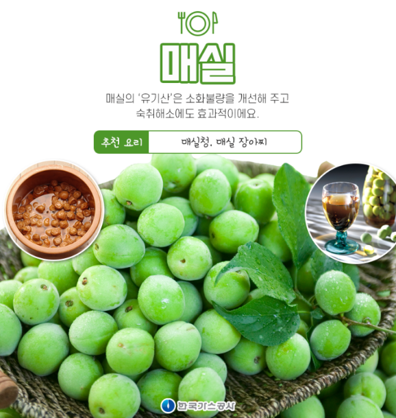 '천연 소화제'로 알려진 매실의 신맛은 소화액을 촉진시켜 소화 불량을 해소하고 위장 장애를 치료한다고 합니다.