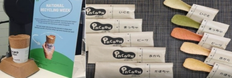 포장 분야에서는 기존 원재료보다 더욱 지속가능하거나, 소비자 흥미까지 유발하는 제품의 개발이 활발하다고 합니다. 일본에서 인기를 누리고 있는 숟가락 파콘(PACOON)은 야채로 만들어졌다고 합니다. 야채 가루를 넣은 밀가루 반죽을 가열해 만들며, 맛은 말차, 비트, 호박 등 다양하다고 합니다. 열에 강하기 때문에 도중에 녹지 않으며, 식후에는 바삭한 스낵처럼 씹어 먹을 수 있다고 합니다.