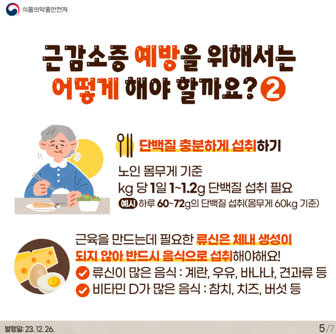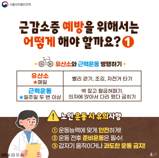 근육은 30세부터 줄어들어 50세부터는 매년 1~2% 손실되고, 70대가 되면 절반으로 줄어들어 노인기에 각별한 주의가 필요합니다.
