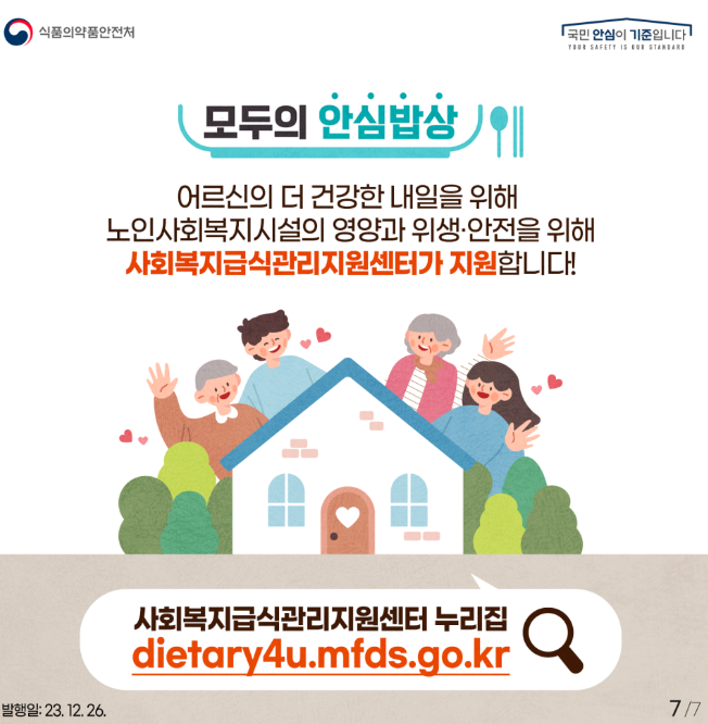 어르신의 더 건강한 내일을 위해 노인사회복지시설의 영양과 위생·안전을 위해 사회복지급식관리지원센터가 지원한다고 합니다.