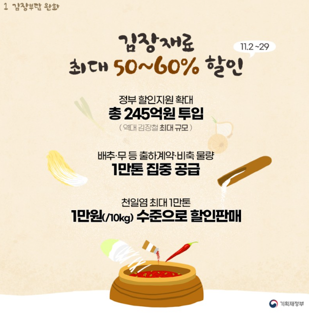 (김장 주재료인 배추와 수급 불안이 우려되는 대파, 생강은 농협 등과 협조하여 대형마트 공급가격인하(11월~12월, 35억 원)하고 농협은 자체 예산을 활용, 하나로마트(2,200여 개), 온라인몰에서 절임배추 등 김장재료를 최대 40% 할인(11.2~29)할 예정이라고 합니다.)
