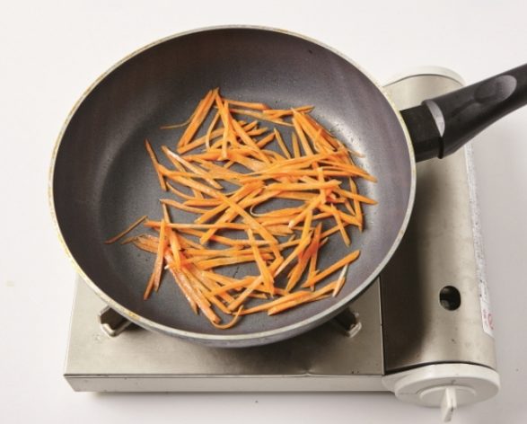 4. 중간 불로 달군 팬에 식용유를 둘러 버섯과 당근에 소금 간을 하여 따로 볶아 꺼냅니다.