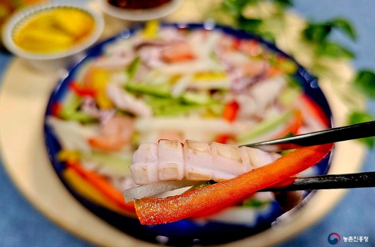 Tip : 오징어, 새우 대신 해파리, 전복 등 다른 해산물을 데쳐 함께 버무려도 좋습니다.