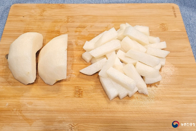 1. 배 1개는 깨끗이 씻어 껍질을 벗겨내고 4등분 해 씨를 제거하고 막대 모양으로 썰어 줍니다.