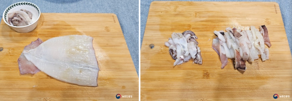 3. 오징어 1마리의 몸통은 안쪽에 격자무늬로 깔집을 넣어 길게 2등분 한 뒤 2cm 두께로 썰고, 다리도 비슷한 길이로 썰어줍니다.