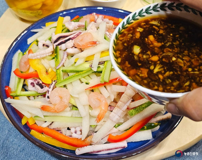 6. 볼에 손질해둔 배와 채소 그리고 오징어와 새우를 넣고 유자 겨자 소스를 부어 버무리면 '배 해물잡채'가 완성입니다.