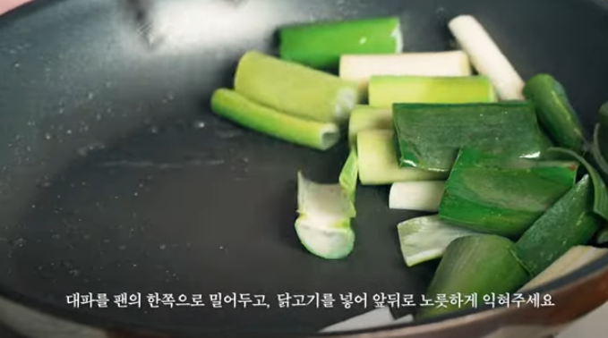 4. 대파를 팬에 한쪽으로 밀어 두고, 닭고기를 넣어 앞뒤로 노릇하게 익힙니다.