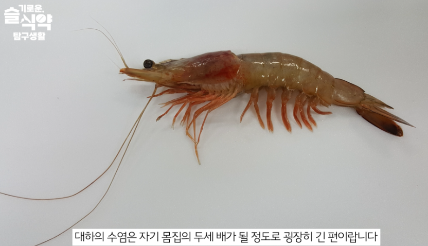 흰다리새우는 더듬이가 매우 짧지만, 대하는 수염으로 보일 만큼 길다고 합니다.
