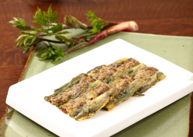 데친 두릅을 빈대떡 반죽으로 조리한 다음 오븐기에 구워내면 간편하게 완성할 수 있습니다. 취향에 따라 야채(당근, 양파, 실파 등)와 해물(오징어, 새우살 등)을 한입 크기로 썰어 반죽에 이용합니다. 고소하면서 향긋한 '두릅적' 레시피를 소개해 드리겠습니다.