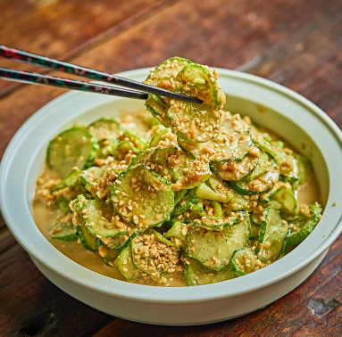'땅콩버터 오이무침'은 샐러드처럼 즐겨도 좋습니다. 또는 면 위에 올려 고명으로 활용해도 좋습니다. 특히 삶은 메밀면 등에 얹으면 고소한 맛의 조합이 훌륭합니다.