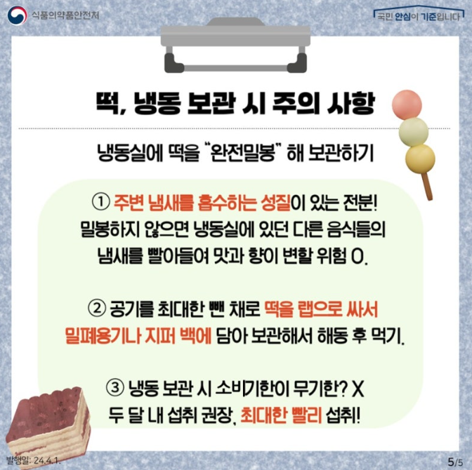 떡의 주성분인 전분은 주변 냄새를 흡수하는 성질이 있어서 밀봉하지 않으면 냉동실에 있던 다른 음식들의 냄새를 빨아들여 맛과 향이 변할 수 있다고 합니다.