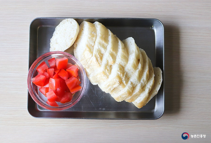 1. 미니바게트 1개는 1cm 두께로 슬라이스 하고 토마토 1/2개는 씨를 제거한 후, 1cm 크기의 큐브 모양으로 썰어줍니다.