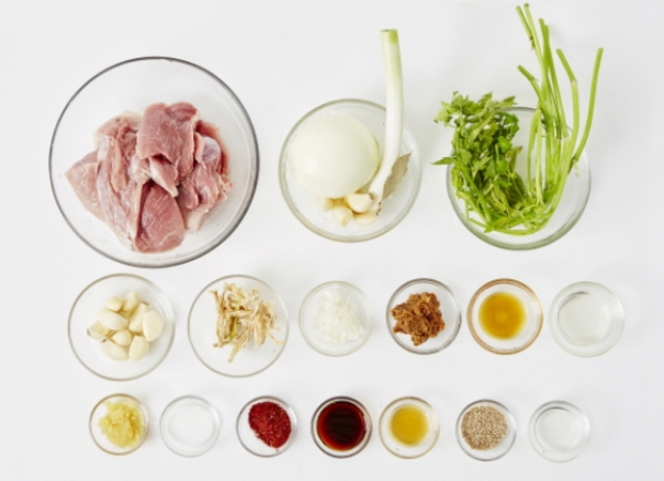 돼지고기 뒷다리살 700g, 무말랭이 1/2컵, 미나리 7대
