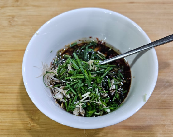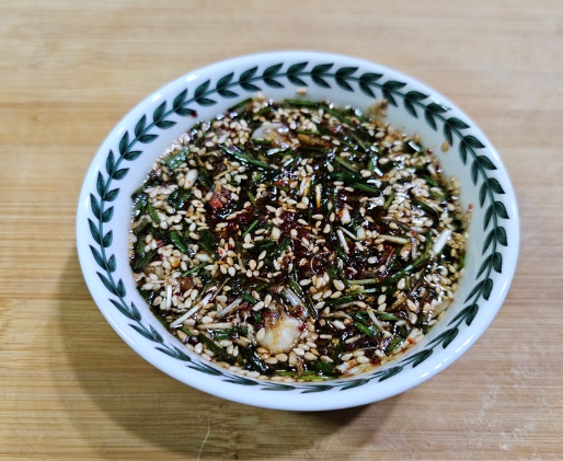 6. 뜸을 들이는 동안 달래 양념장을 만들어줍니다. 달래는 깨끗하게 씻어 비벼 먹기 좋게 송송 썰어 양념장 재료와 함께 잘 섞어줍니다.