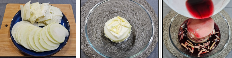 4. 그릇에 무와 썰어 놓은 양배추를 켜켜이 올리고 중간 중간에 마늘과 생강을 올려줍니다. 까나리액젓과 소금, 설탕, 식초와 비트를 넣어 피클 소스를 만들어 켜켜이 쌓은 무와 양배추 위에 붓고 비트 색이 들도록 절 절여줍니다.