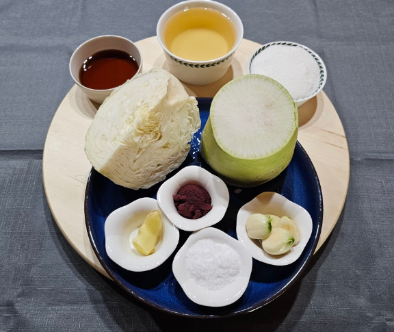 무 600g, 양배추 300g, 마늘 3쪽, 생강 1쪽, 까나리액젓 50g, 소금 60g, 설탕 200g, 식초 300g, 비트(가루) 1스푼