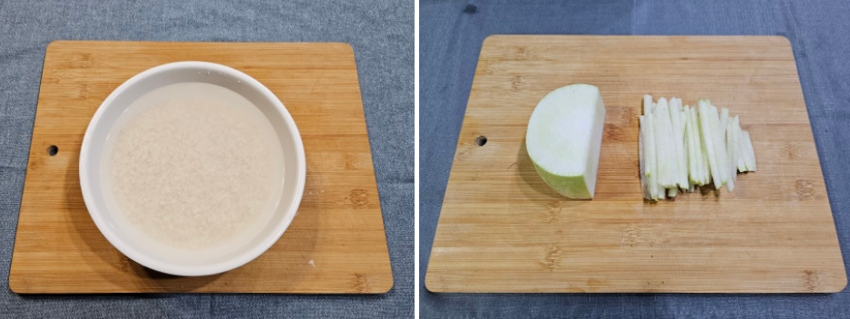 2. 무는 동그랗게 편을 썬 다음 굵게 채를 썰어줍니다. 너무 가늘게 썰면 밥을 했을 때 으스러질 수 있습니다.