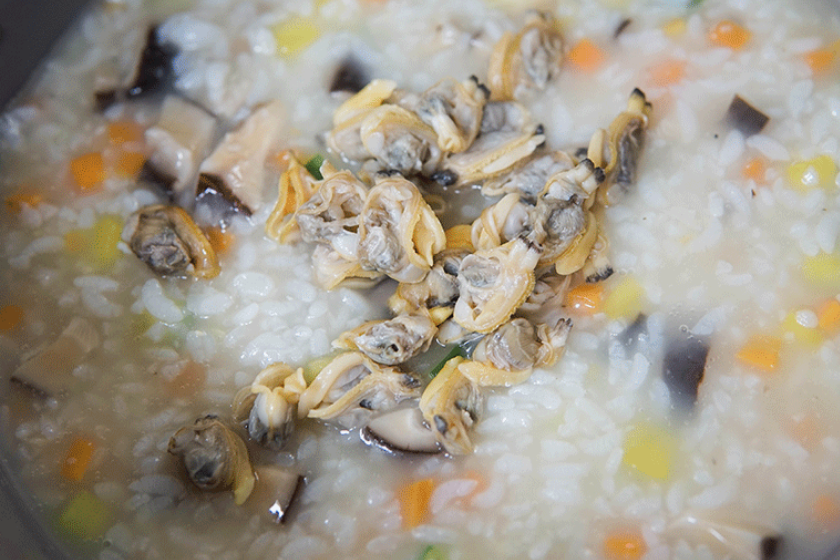 4. 쌀이 어느 정도 퍼지면 바지락 살을 넣고 소금 또는 간장으로 간을 맞춰 완성합니다.