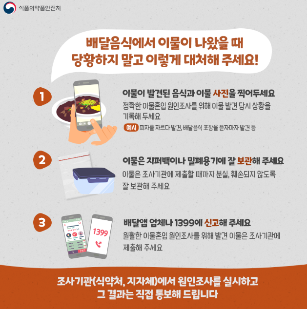배달음식을 시켰는데 이물이 나왔을 때는 배달앱업체 또는 식약처에 신고해 주세요!